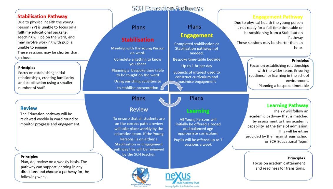 On the fourth day following admission (or straight after readmission), all children from Y1 to Y11 are offered a minimum of one, up-to 45-minute lesson per day which is guided by the child’s home school curriculum and underpinned by the Kingfisher Academy curriculum. Although a focus is placed more heavily on core subjects, a variety of subjects are offered to ensure children receive breadth and balance across the duration of their stay along with other enrichment opportunities such as cooking, music and PE.